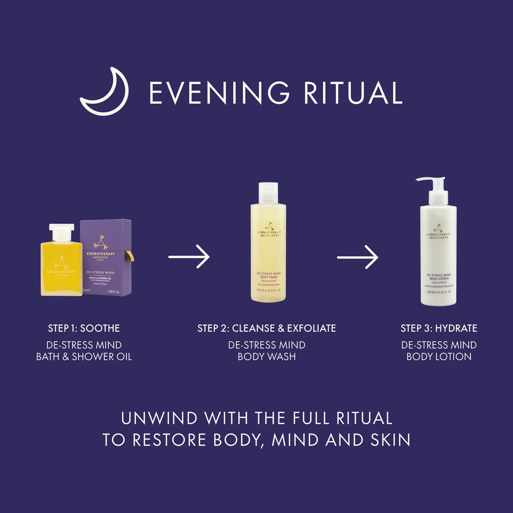 Before stepping into your bath or shower, apply our De-Stress Mind Bath & Shower Oil onto dry skin to let it absorb before cleansing. We recommend your chest, torso or particularly dry patches to leave your skin soft, nourished and beautifully scented.