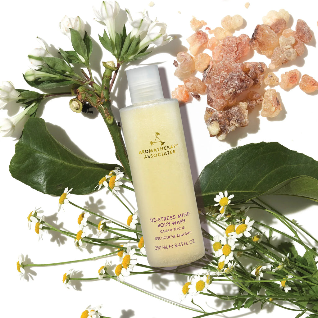Apply our new De-Stress Mind Body Wash, working it into gentle circles over your body. AHAs softly exfoliates and renews your skin's texture, probiotics balance your skin, and squalane deeply hydrates.